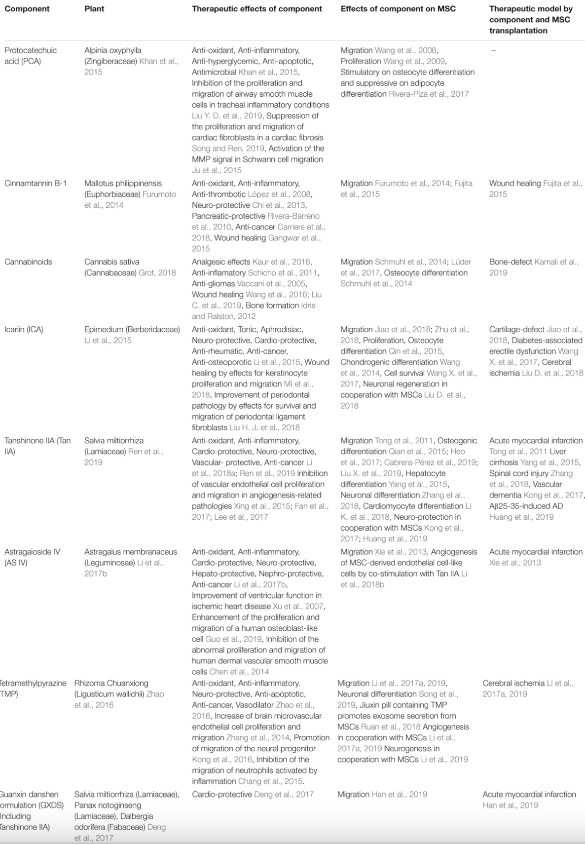 Исследования лекарственных растений показали, что компоненты растительного происхождения могут активировать клеточные функции. Например, несколько компонентов растительного происхождения активируют сигнальные пути клеток, такие как фосфатидилинозитол-3-киназа и митоген-активируемая протеинкиназа (МАРК), усиливают экспрессию оси CXCL12/CXCR4, стимулируют ремоделирование внеклеточного матрикса и, следовательно, способствуют миграции МСК. Более того, было показано, что компоненты растительного происхождения стимулируют привлечение МСК к поврежденным тканям и ускоряют заживление при моделировании заболеваний, что потенциально расширяет возможности их терапевтического применения.