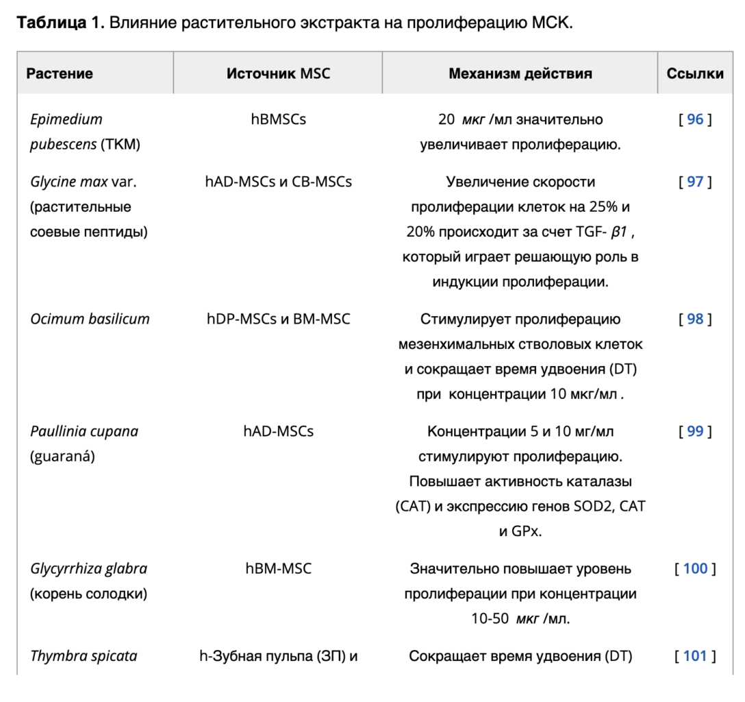 Экстракты также увеличивают пролиферацию плюрипотентных стволовых клеток и обладают противораковым действием.лекарственные растения привлекают значительное внимание как стимуляторы пролиферации стволовых клеток in vivo и in vitro. Исследования in vitro природных биоактивных соединений показали, что вещества растительного происхождения усиливают пролиферацию взрослых стволовых клеток и, с другой стороны, ингибируют пролиферацию раковых клеток.